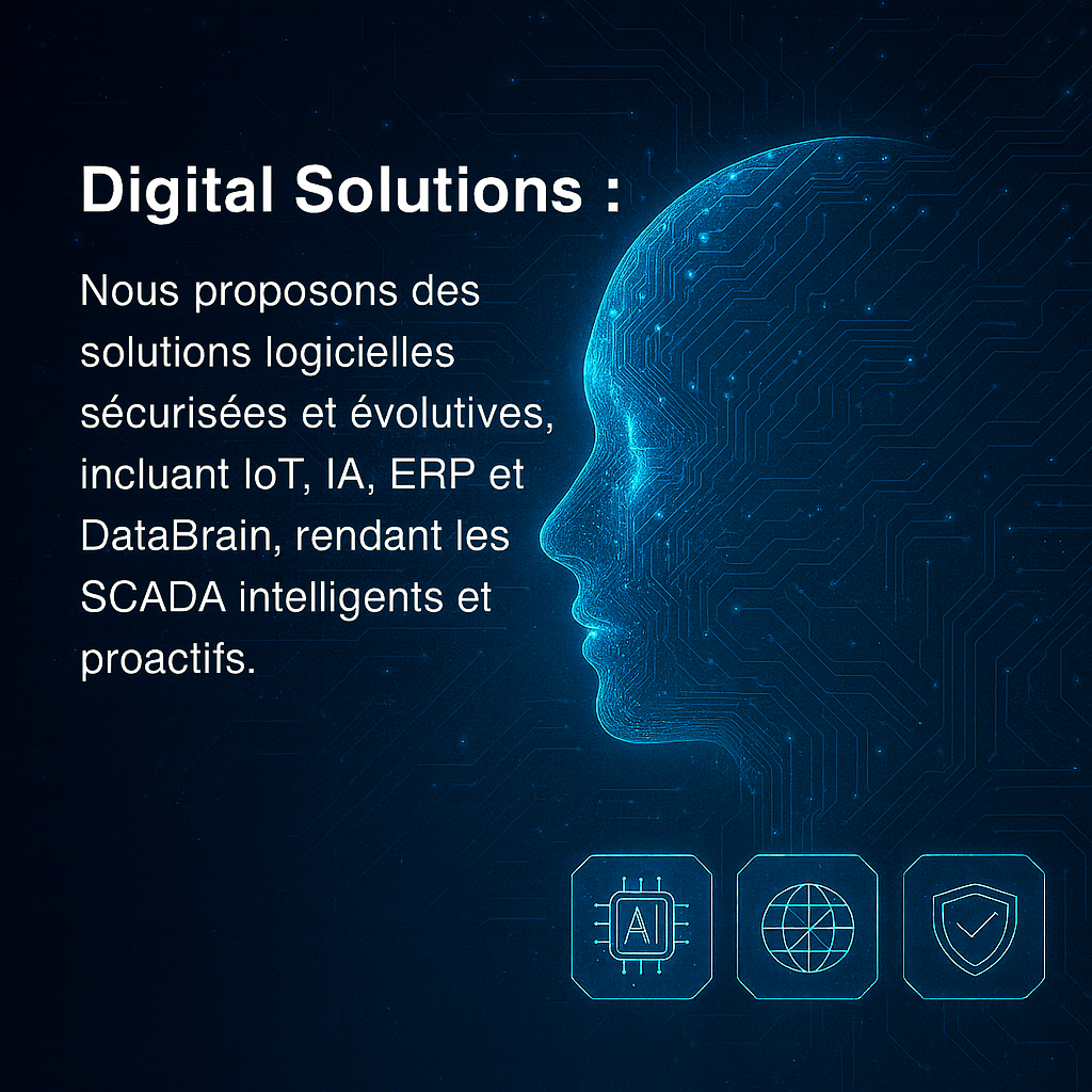 Nous proposons des solutions logicielles sécurisées et évolutives, incluant IoT, IA, ERP et DataBrain, rendant les SCADA intelligents et proactifs.